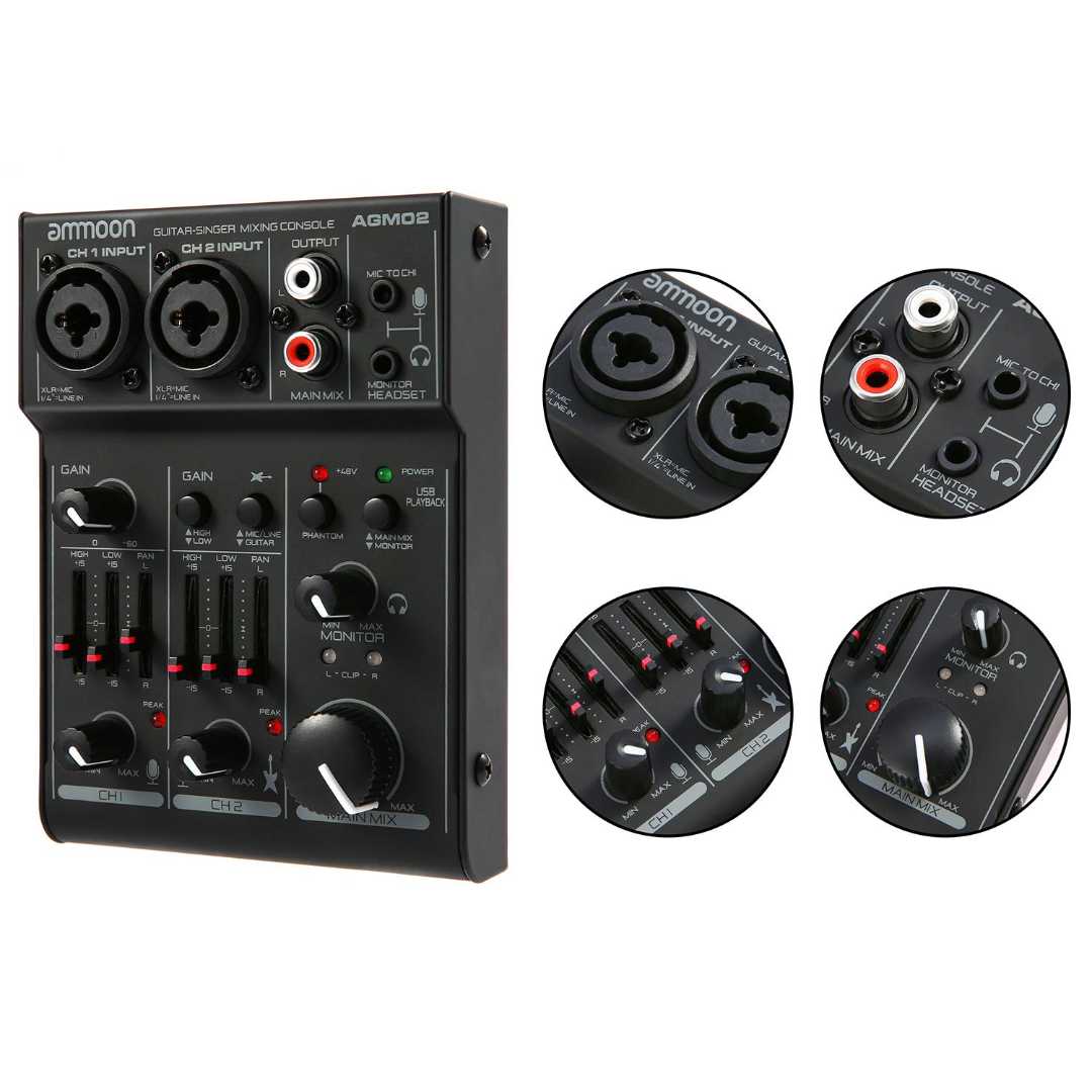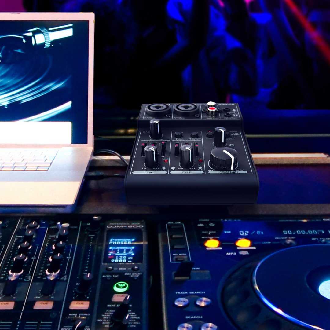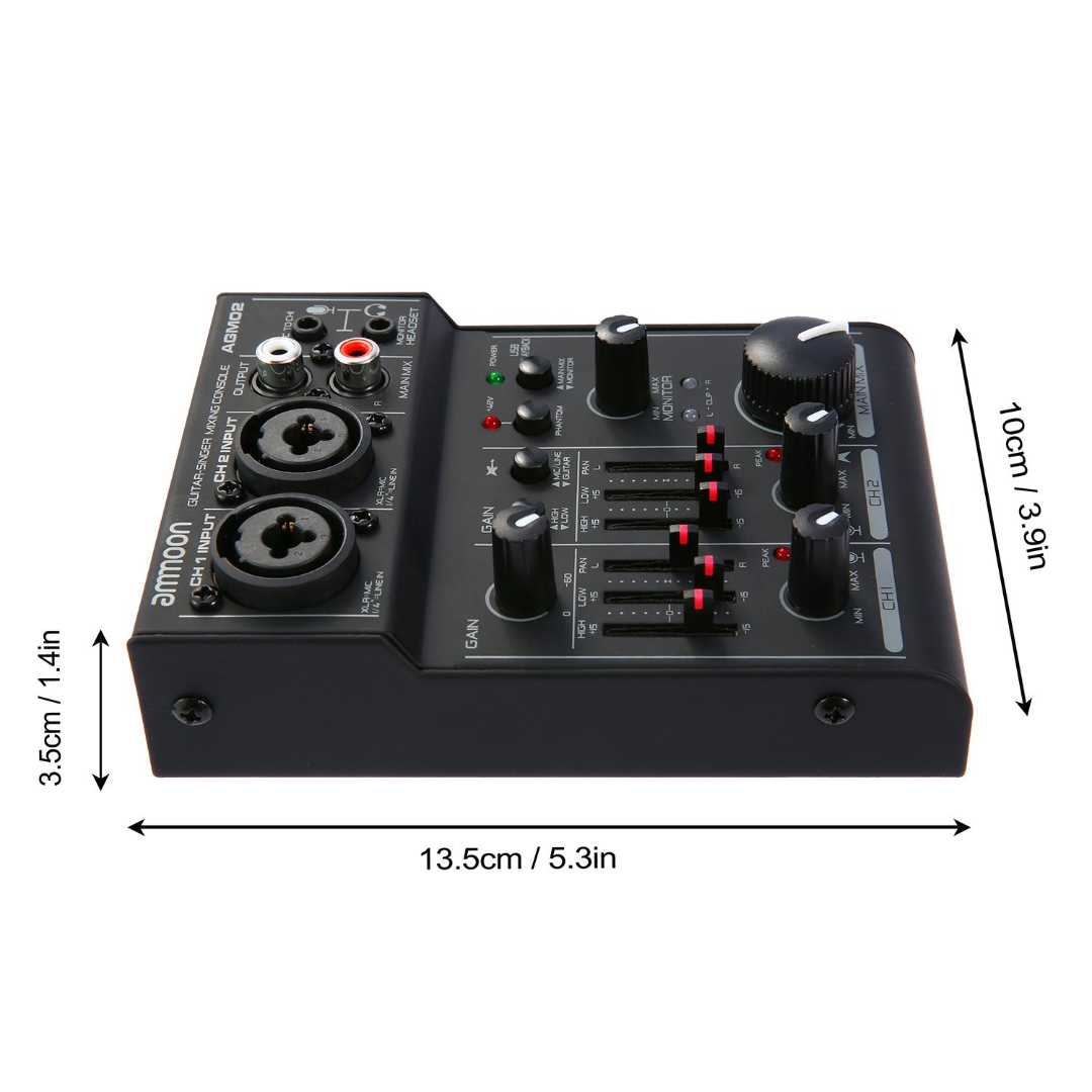 Super mini 2-channel mixing console designed for home stuido recording, network live broadcast, karaoke, etc; 5V low voltage power supply design, can be powered by computer or 5V power bank through the including USB cable, easy to carry and convenient to use.