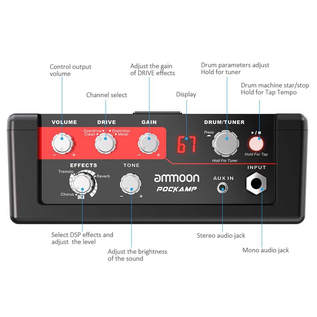 Features 80 drum rhythms to jam along with tap tempo; 4 DRIVE models( Clean/Overdrive/Distortion/Metal) provide a gain range for every musical style; 3 DSP effects (Chorus/Tremolo/Reverb) for you to create your own guitar tones; Built-in tuner to ensure you’re instrument is always in tune.