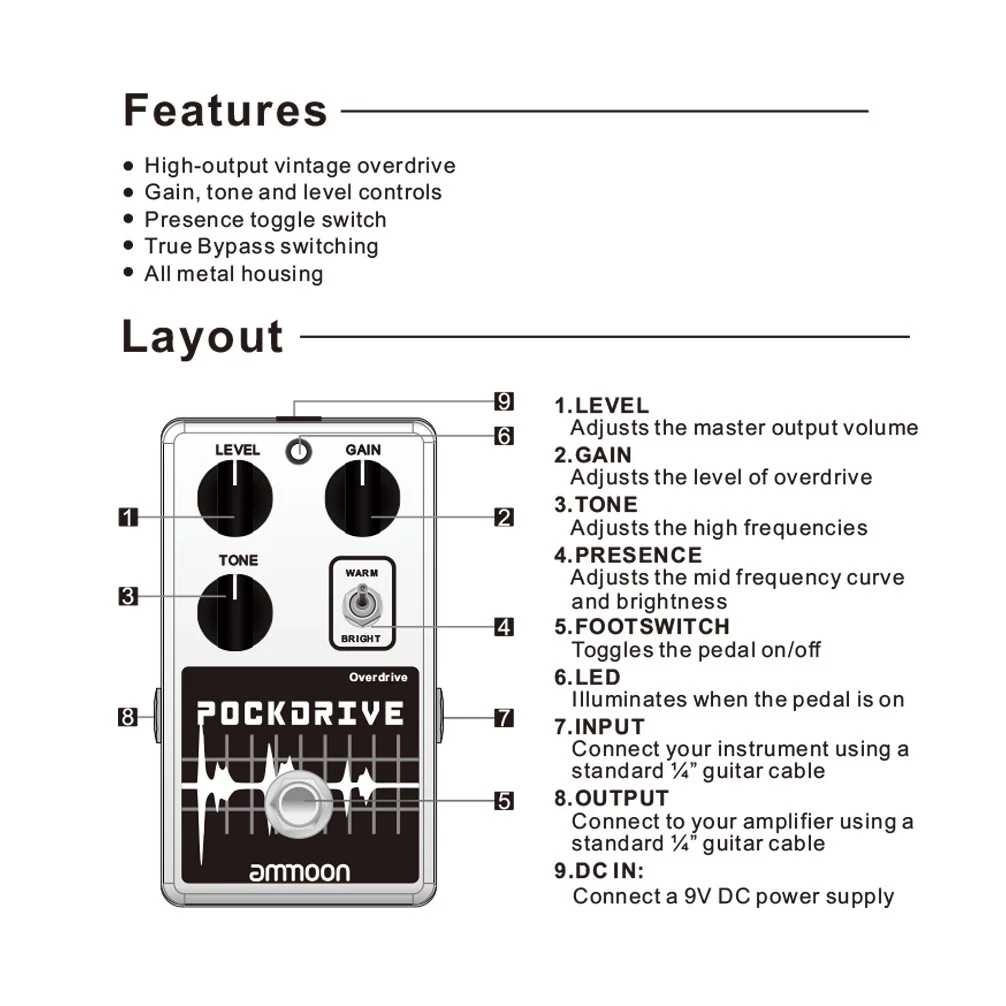 Full metal shell, sturdy and durable; with standard 1/4" mono input/ output jack.