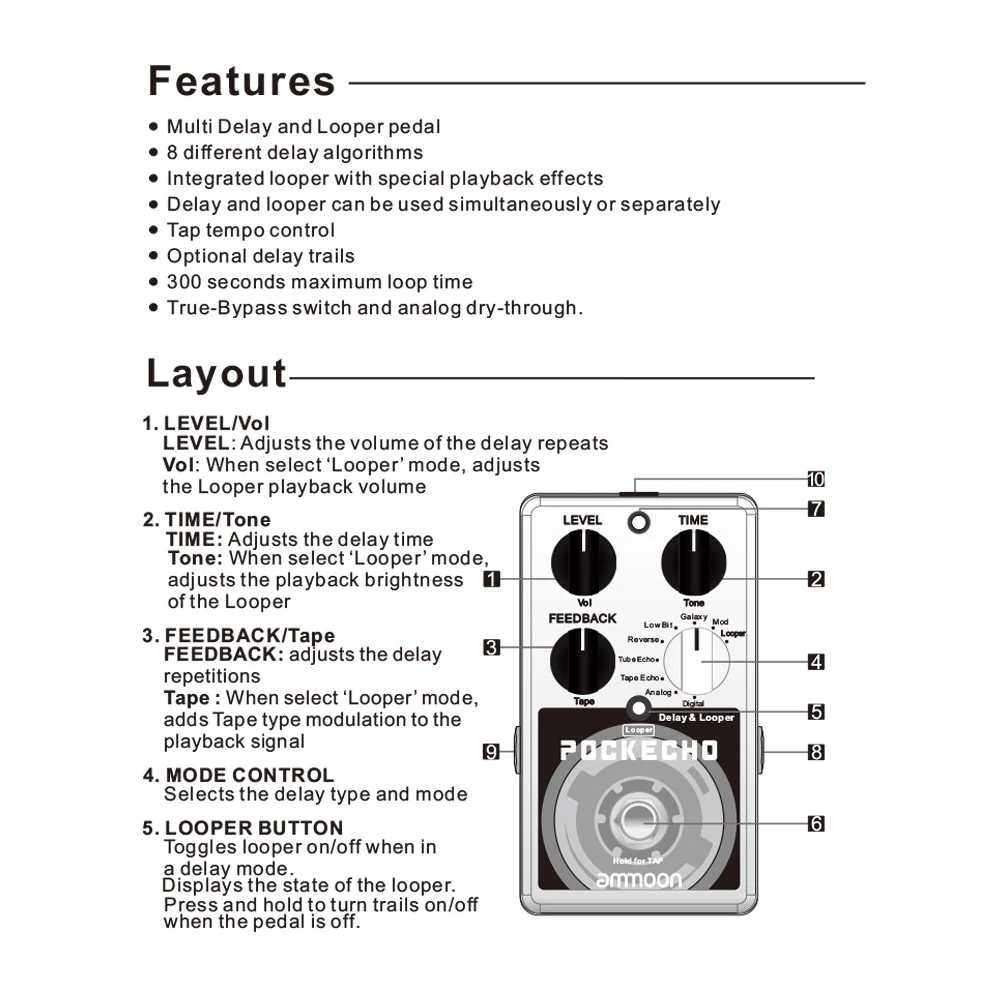 The ammoon POCKECHO combines multi delay effects and looper into one small pedal. You can use the delay and looper independently or simultaneously to get various tones. And the tap tempo function and optional bypass trails make you have yourself a hugely versatile pedal that should be in the toolbox of every musician.