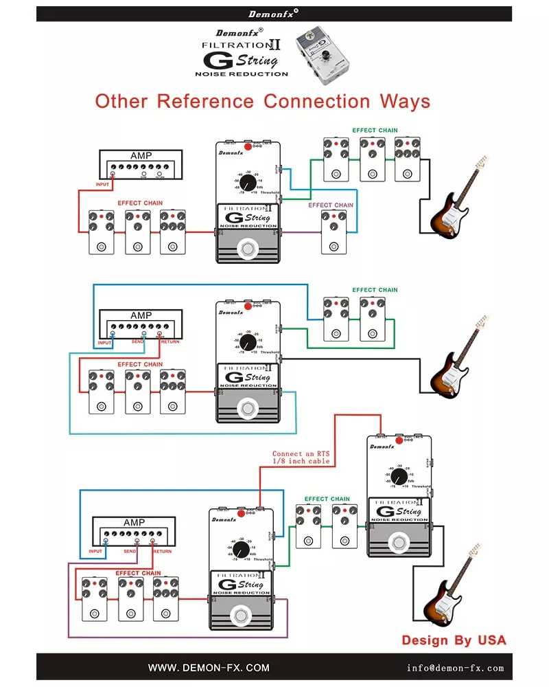 The FILTRATION II G String has 4 1/4 inch jacks. Connect the guitar directly to the Guitar IN. Connect the Guitar OUT to the input of the amplifier. Connect the DEC IN to the loop send and DEC OUT to the loop return. For best performance place all gain pedals in front of the amplifier and DEC IN. You can put Delay and Reverb effects pedals after the FILTRATION II G String and before the loop return to avoid cutting off reverb and delay tails.