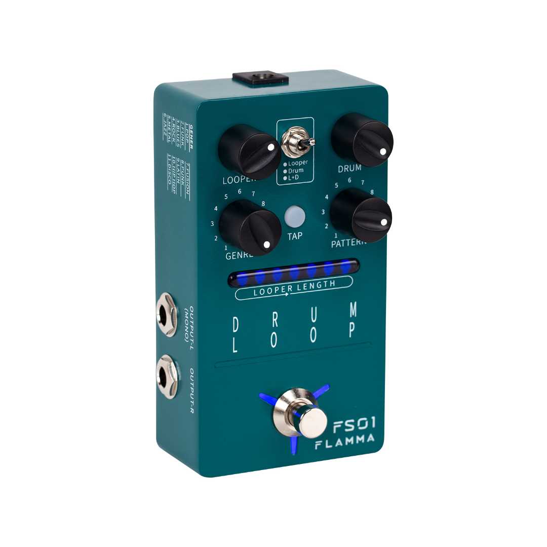 The FS01 Drum Loop pedal features a full-featured drum machine and looper with stereo outputs at an unbeatable price. The Looper provides a whopping 20 minutes of recording time and can be used independently or simultaneously with the drum machine. The FS01 also includes a visual bar indicator to accompany the looper and ensure perfectly timed loops and dubs. The drum machine features 11 different grooves styles to choose from with each groove having multiple time signature and tempo variations for a total of 121 different beats. Whether performing live or using the FS01 as a practice companion, individual looper and drum machine volume controls and stereo outputs allow you to find the perfect balance.