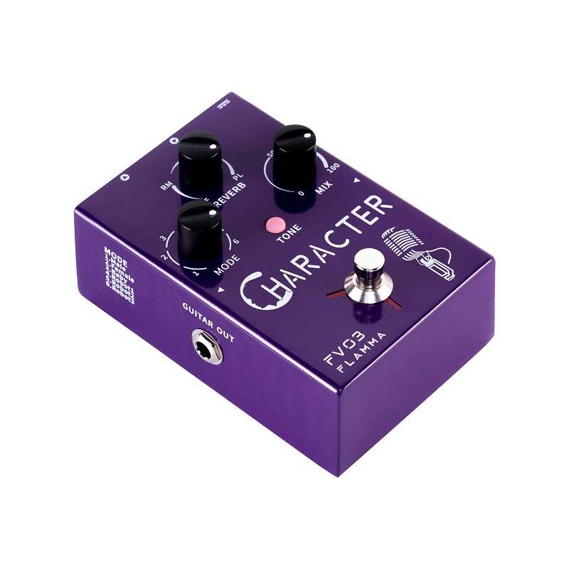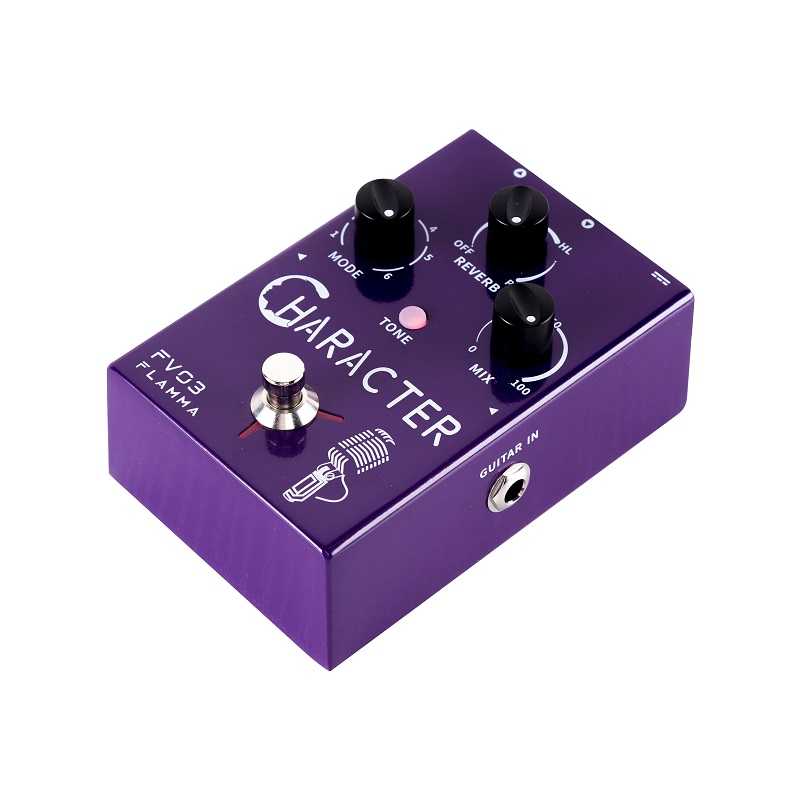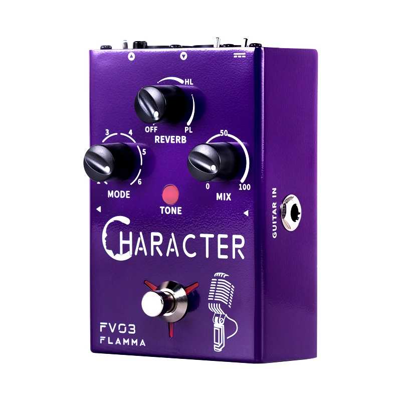 The FV03 is designed to be easily integrated into your pedal setup by offering mixed or individual signal in/out options for your guitar, microphone, or both. Knob layout includes Reverb effect selection and volume, vocal effects mode selection, and a Mix knob to set the levels of effects to your dry signal. Input and output options feature Mic in with XLR balanced out as well as Guitar in/out channels. Balanced output grounding switch and a phantom power switch are also included to help with setup in a variety of different situations. Get creative and add some characters to your live show with the FV03 Character from Flamma Innovation!