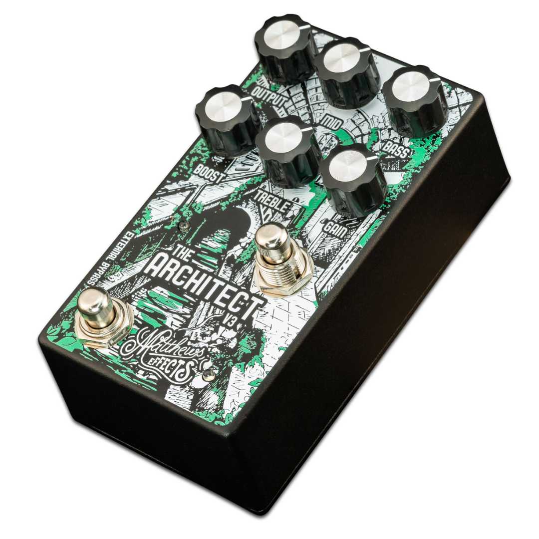 The Architect V3 is Rick Matthews' unique take on the legendary klon circuit, which has formed the tone of countless guitar players. Matthews Effects is the first company to take this legendary design to new heights by building in an active three band EQ which sculpts the tone of the overdrive. The option to select from three distinct clipping modes allows you to perfectly pair this pedal with any guitar/amp combination. The boost channel offers two independent circuits to choose from, giving you vast control of your tonal blueprints. With the Architect V3 you can create layered, clean boosts, to dynamically push your amp with powerful EQ dialing, or crank up the gain and shake the very earth. There is always more to discover and build on with the Architect V3.