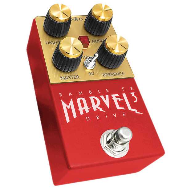 Marvel Drive has an innovative dual voltage switch. No need for an 18V supply, it can turn any voltage connected (9-20V) into 9V and 18V switchable on the fly. Set to 18V, Marvel Drive will be louder and have a sharper attack.