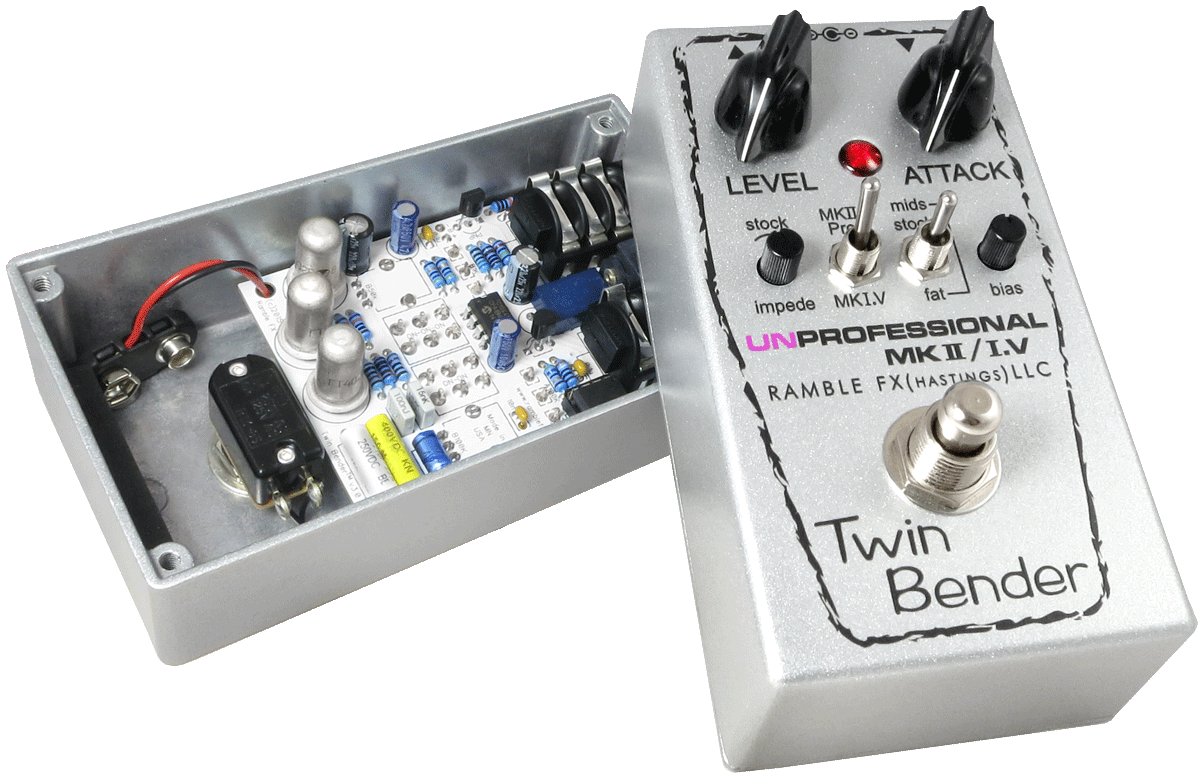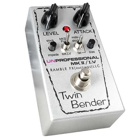 Twin Bender has a long list of features that make it the most versatile and user friendly Tone Bender available. The MKII Pro/MKI.V switch makes it two 'Benders in one. MK1.5 mode uses one less transistor for less fuzz. The 'impede' (impedance) mini-knob allows Twin Bender to be used after a wah, buffer, wireless, etc., something that most vintage fuzzes cannot do very well. It also has a built-in voltage inverter, bias control, and relay-based true bypass switching.