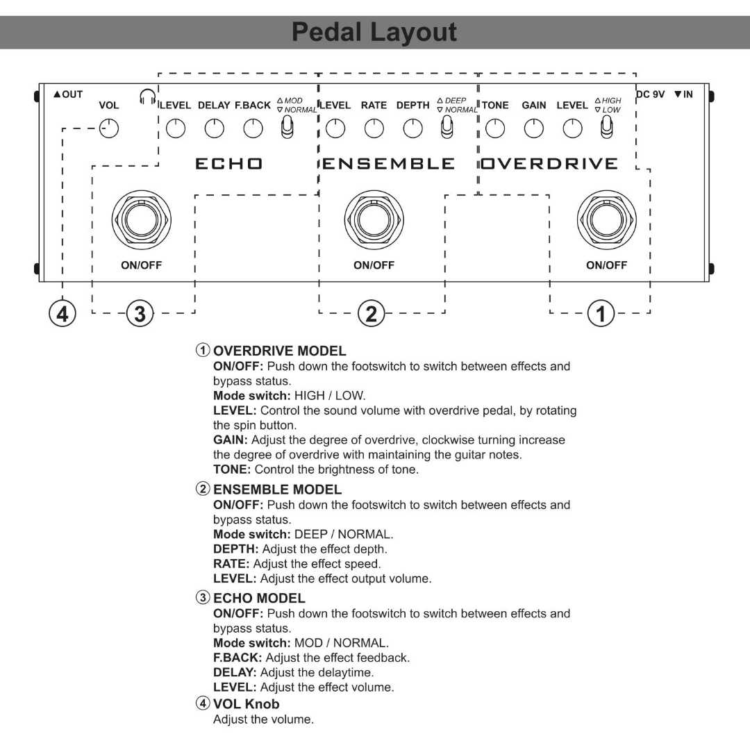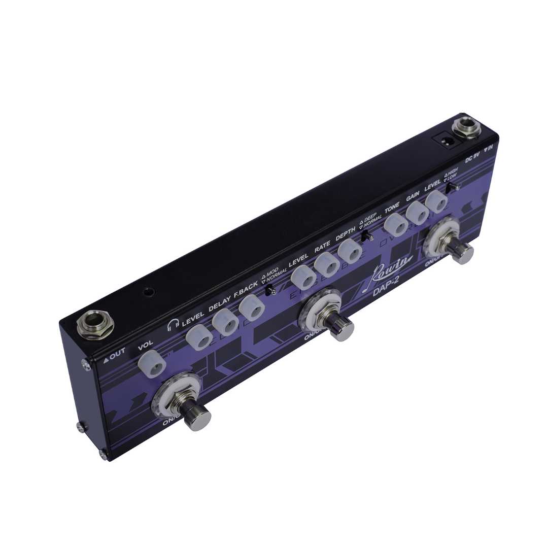 Echo: It's a well-designed filter circuit gives you a warm tone like analog delay. The wide delay range makes it suitable for various styles of performance. With level(adjust the effect volume), delay(adjust the delay time) and feedback(adjust the effect feedback) knobs.
