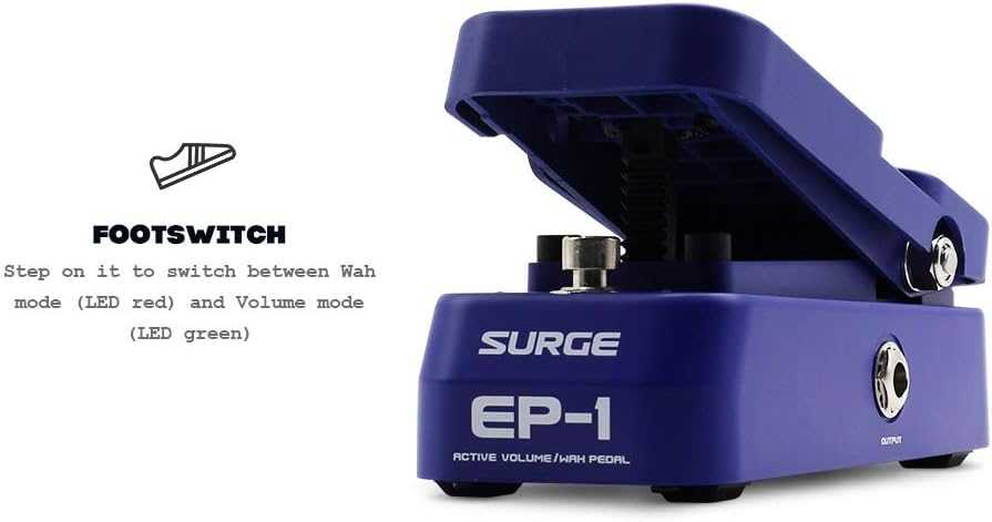 An LED next to the footswitch indicates which mode the pedal is in (green = volume, red = wah).